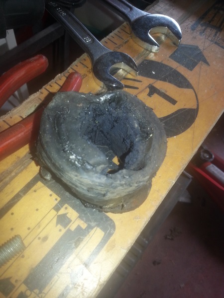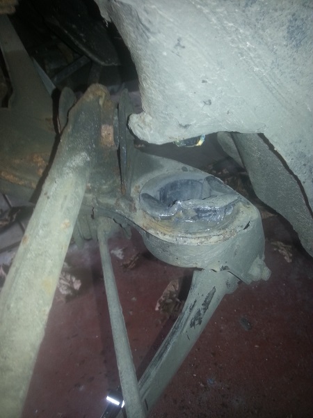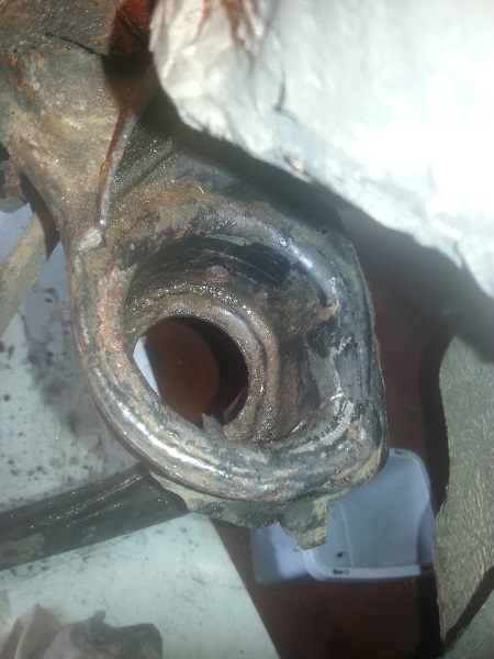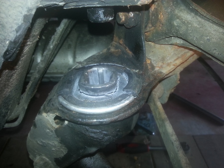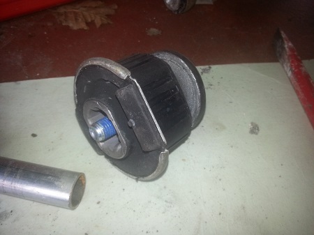 Door een brandertje onder de draagarm te zetten en deze flink te verwarmen, konden we het oude rubber eruit halen. Daarna goed schoonmaken en opnieuw flink verwarmen. Dan het nieuwe rubber er (gedeeltelijk) inzetten. Blijven verwarmen en dan de krik laten zakken. Door het gewicht van de auto, kwam het rubber meteen op zijn plek. Teminste... bij de tweede. Want bij het eerste rubber hadden we het zonder brander gedaan.... niet te doen!